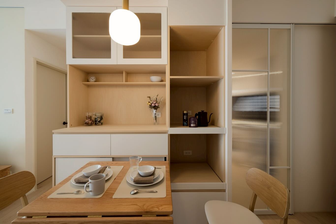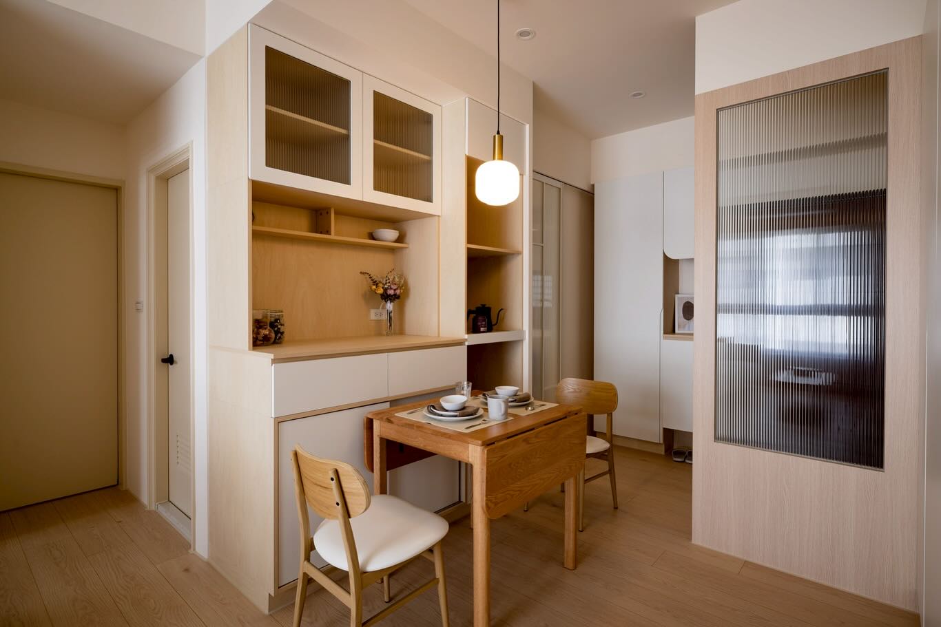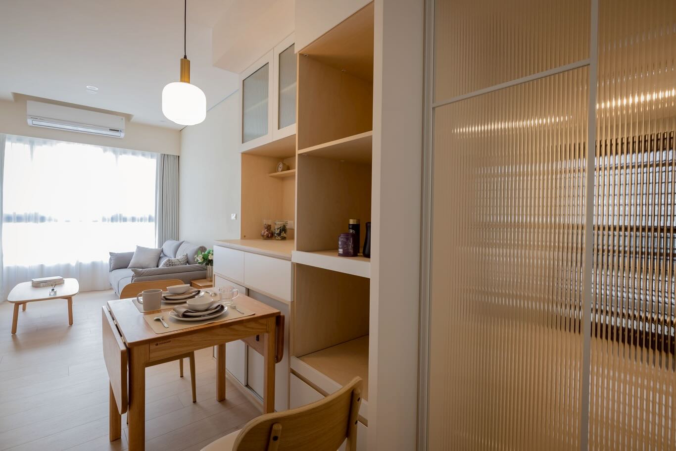 日式侘寂與優雅: 以木質柔和的主色調搭配大量的留白,點綴長虹玻璃與弧形元素,當光線透過窗戶灑入,反射出生活的自然光影,弧型修飾手法搭配色漆,柔化空間的硬度,櫃體造型也能充分利用梁下空間。