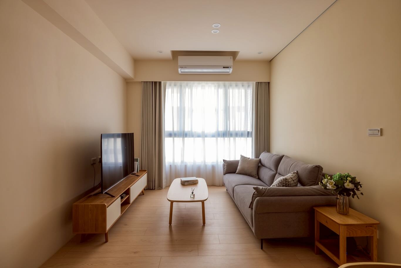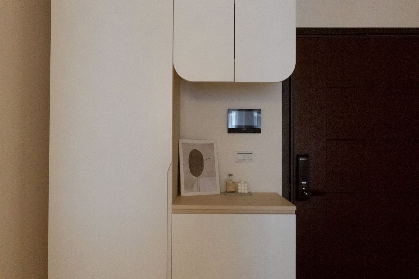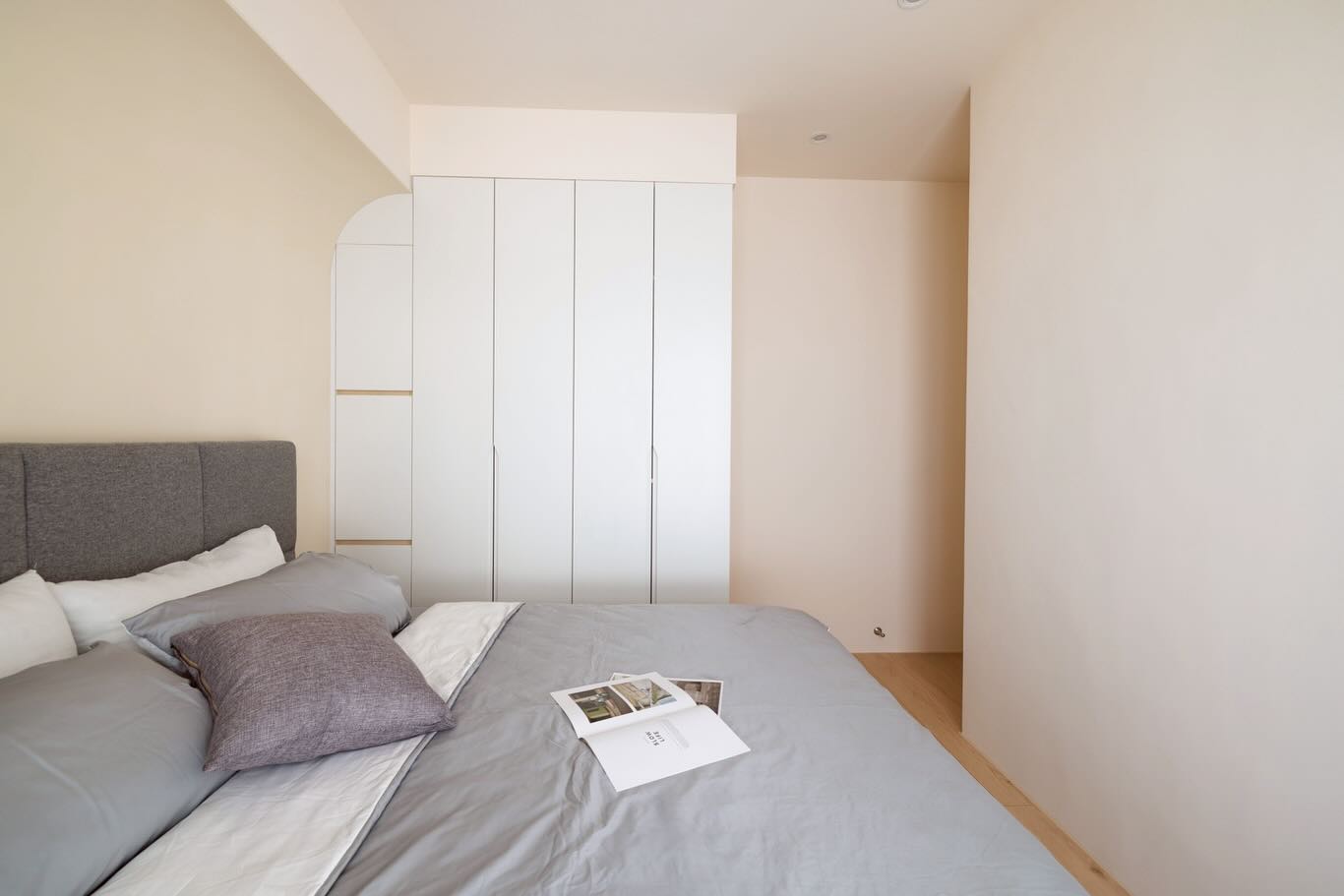 日式侘寂與優雅: 以木質柔和的主色調搭配大量的留白,點綴長虹玻璃與弧形元素,當光線透過窗戶灑入,反射出生活的自然光影,弧型修飾手法搭配色漆,柔化空間的硬度,櫃體造型也能充分利用梁下空間。