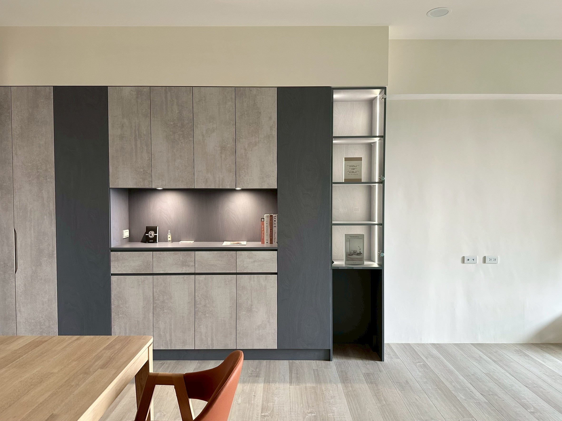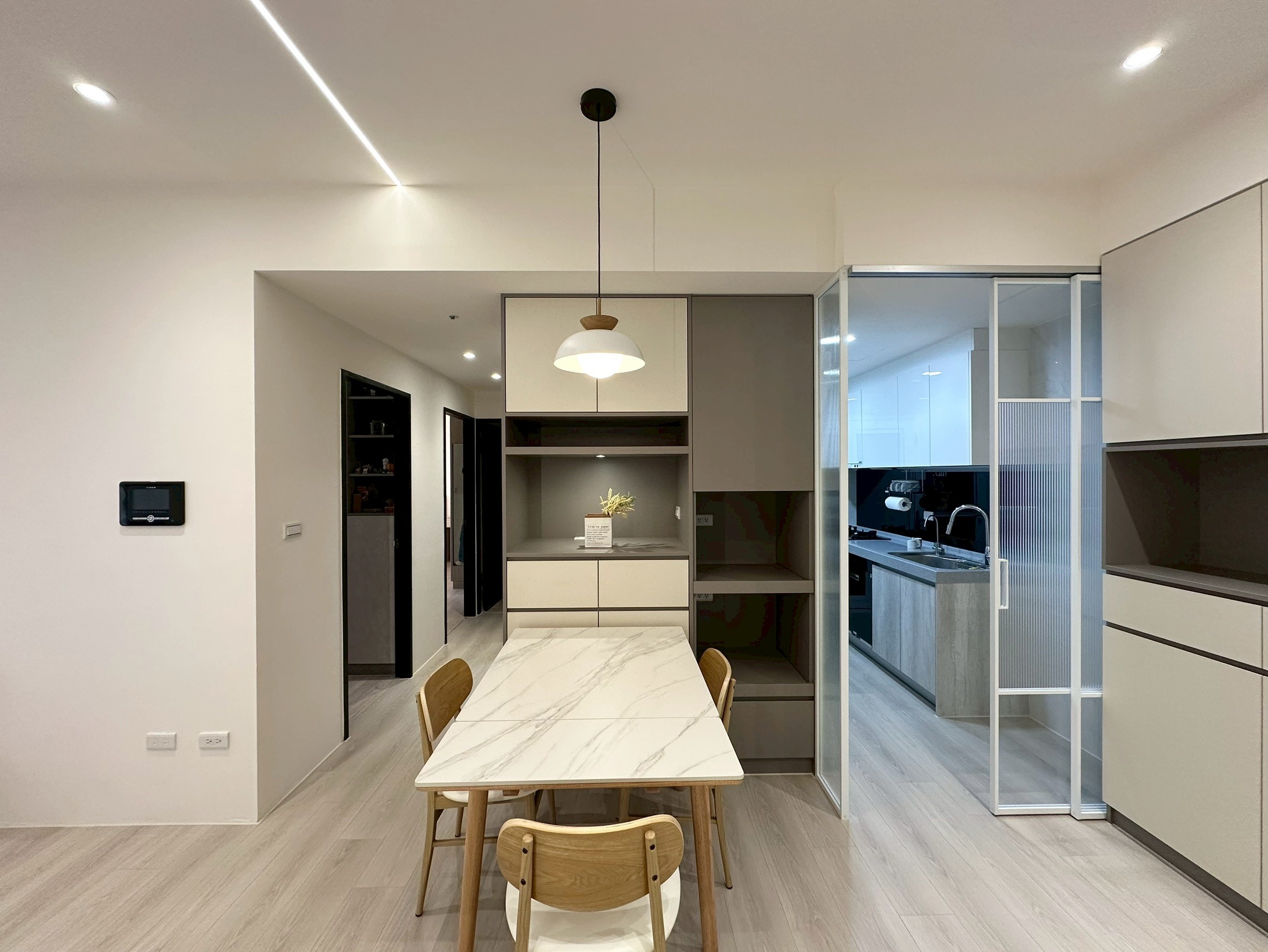 屏風玻璃鋁框、隱形門、吧台電器收納桌、人造石面板、花磚泥作工程、廚房電器櫃體等,均可於諮詢時與設計師確認。